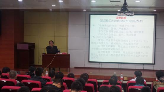 (电气学院 毛潇晗 吴涛)为了贯彻落实教育部第41号令,学习和遵守校园常见法律法规知识。10月12日下午,校学工处李世锋处长在金银湖图书馆报告厅举办专题讲座,为同学们讲解教育部第41号令法律法规。电气学院分党委副书记佘珠花、各班主任老师们、年级辅导员等师生200余人参加讲座。
