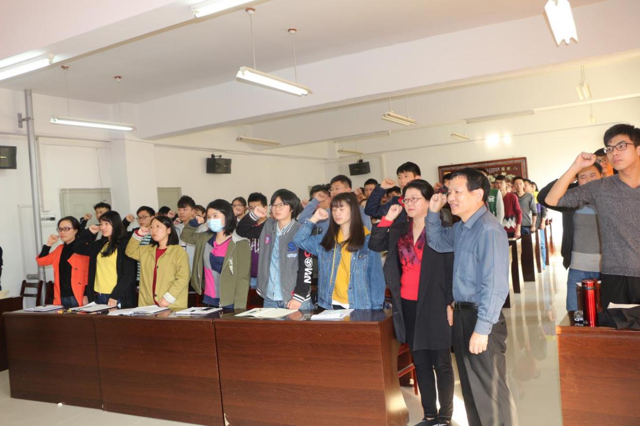 随后,在神圣庄严的氛围中,二十一位新党员面向党旗党徽宣誓,在场其他党员与他们一起重温了入党誓词。优秀学生党员代表王婉君同学与大家分享了自己接受党的教育,参加党员教育自我实践岗活动后的感悟和体验,她表示通过入党以及党务整理工作提高了自己的思想觉悟。