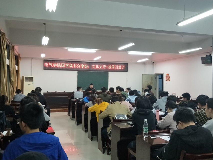 (电气学院 刘维丹)为弘扬传统文化,汲取国学精髓,2018年3月28日晚19:00,由电气学院国学读书会主办的《文化史诗——战国四君子》分享会于金银湖校区电气楼528教室成功举办。国学读书会全体成员以及17级班级代表参加了此次分享会,分享会的主讲人是我院15级电气工程及其自动化专业的吴杨。电气学院分党委副书记佘珠花老师,学工处姚旭老师,电气学院分团委书记李方露老师也受邀参与本次活动。
